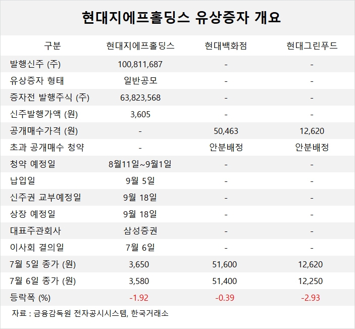 이번 유상증자는 자본시장과 금융투자업에 관한 법률 제133조에 따른 공개매수 방식에 의거하고 일반공모증자방식에 준하여 진행되나 청약 및 신주배정의 대상은 현대그린푸드와 현대백화점의 주주 중 공개매수에 응한 주주들로 한정된다고 현대지에프홀딩스가 공시했습니다.