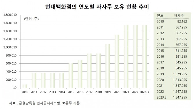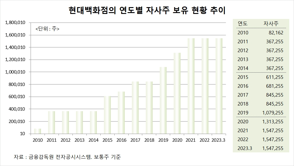 현대백화점은 올해 3월말 기준으로 자기주식수 154만7255주(지분 6.61%)를 보유하고 있습니다.