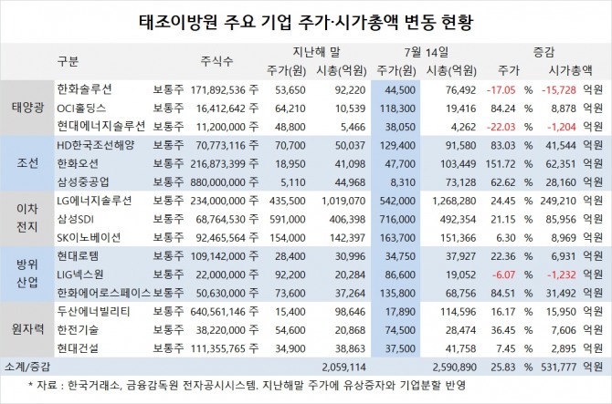 태조이방원의 주요 15개 종목은 지난해 말 시가총액이 205조9114억원에서 7월 14일 시총이 259조890억원으로 25.83%(53조17775억원) 증가했습니다. 태조이방원 종목의 지난해 말 종가에는 기업분할과 유상증자 등이 반영됐습니다.