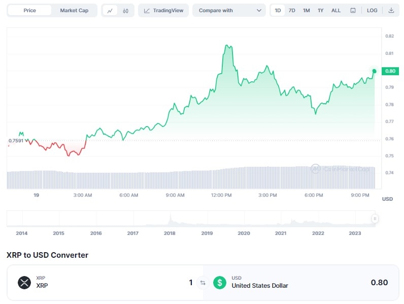 19일 한국 시간 오후 10시 38분 코인게코 데이터에 따르면 리플의 XRP 토큰은 지난 하루 동안 6.1% 급등해 약 0.80달러에 거래되고 있다.