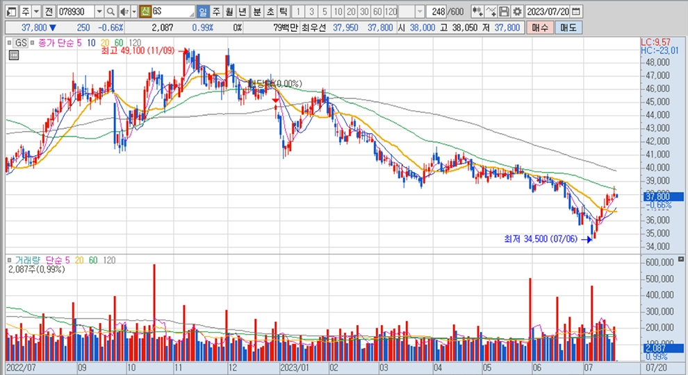 이미지 확대보기GS의 주가는 20일 오전 9시 3분 현재 전일보다 250원(0.66%) 내린 3만7800원에 거래되고 있습니다.