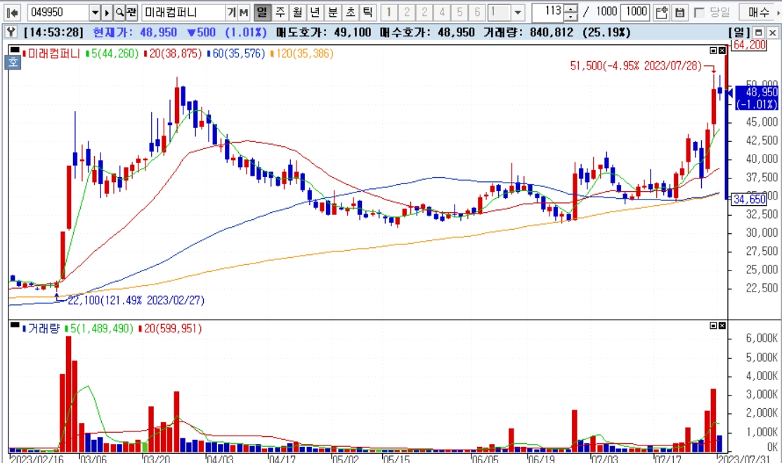 31일 주식시장에 따르면, 미래컴퍼니는 지난 28일 기존의 연중 최고치를 갈아치우며 장중 최고가로 5만1500원을 기록한 후 이날은 숨고르기에 들어갔다.