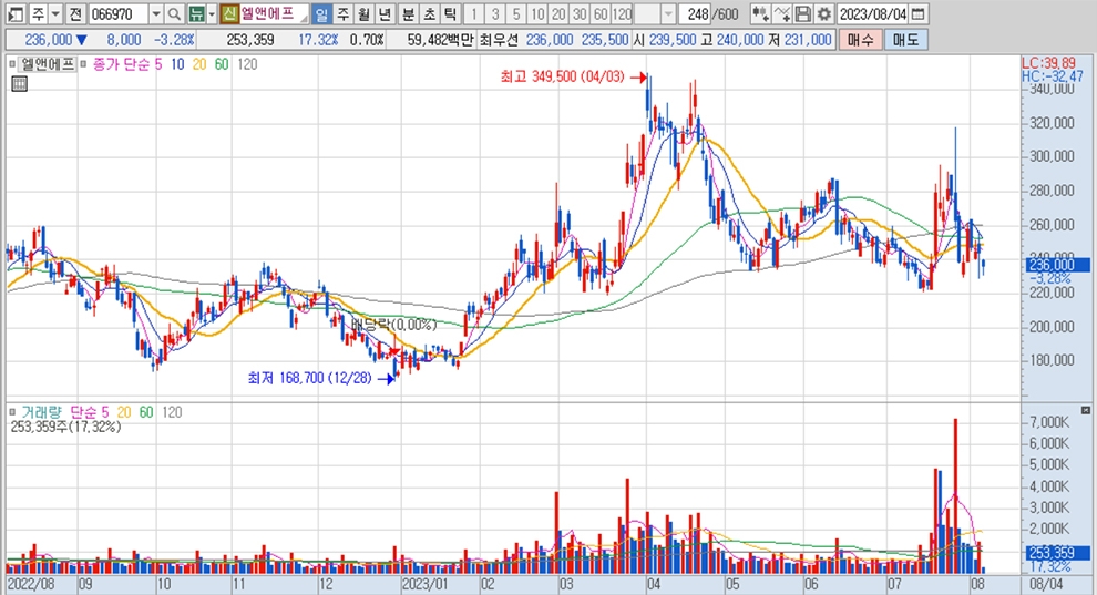 이미지 확대보기엘앤에프의 주가는 4일 오전 9시 10분 현재 전일보다 8000원(3.28%) 내린 23만6000원에 매매되고 있습니다.
