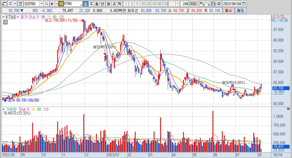 이미지 확대보기KT&G의 주가는 4일 오전 9시 40분 현재 전일보다 300원(0.36%) 내린 8만3700원에 거래되고 있습니다.