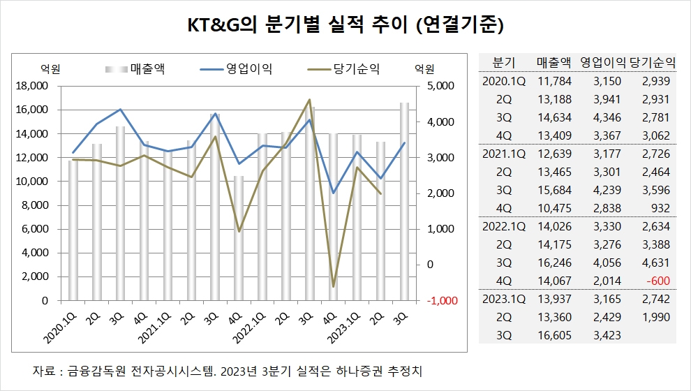 하나증권은 KT&G의 3분기 연결기준 매출액이 1조6605억원, 영업이익이 3423억원에 이를 것으로 전망하고 있습니다.