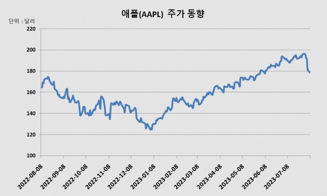 이미지 확대보기7일(현지시각) 뉴욕증시에서 애플은 전거래일 보다 1.7% 하락한 178.85달러에 거래를 마감했다. 지난 1일 하락 마감이후 연속으로 5거래일째 내리막이다.