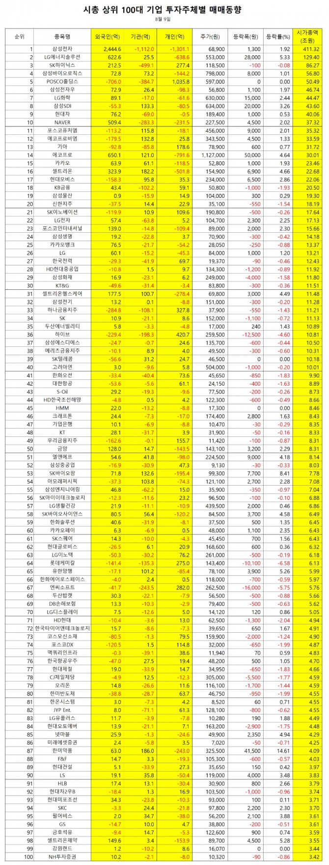 다음은 9일 주식시장의 주요 투자주체별 순매수 및 순매도 상위 20개 종목 현황이다.