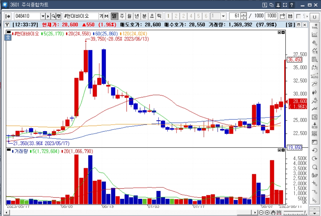 한국거래소에 따르면 현대바이오 주가는 지난 11일 종가 2만8600원으로 일주일 전인 4일 주가 2만4150원과 비교해 한주간 18.43% 상승했다.