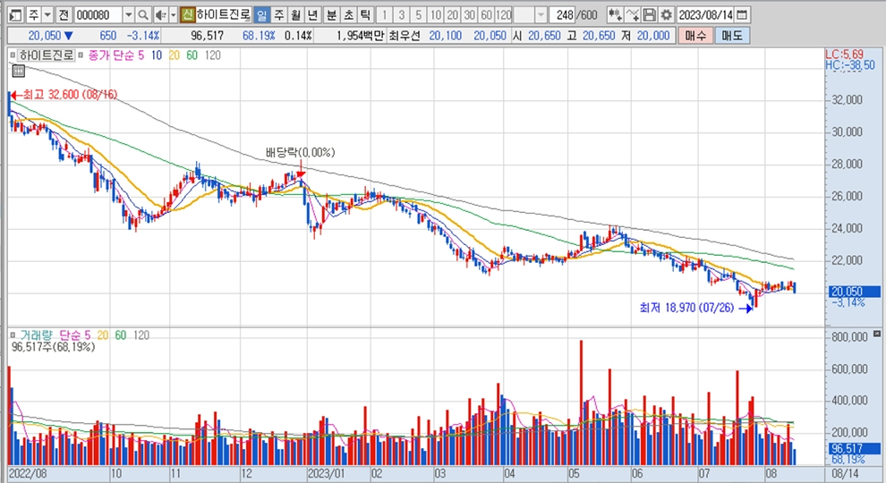 이미지 확대보기하이트진로의 주가는 14일 오전 9시 25분 현재 전일보다 650원(3.14%) 내린 2만50원에 거래되고 있습니다.