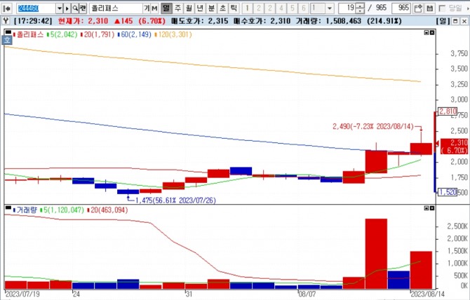 이미지 확대보기14일 한국거래소에 따르면, 이날 정규 거래에서 올리패스 종목은 6.7% 상승한 2310원에 거래를 마감하면서 비교적 선방했다. 하지만, 이어진 시간외거래에서 오후 5시 32분 현재 종가 대비 9.96% 하락한 2080원에 거래되고 있다.