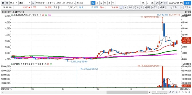 이미지 확대보기나스닥(NASDAQ) 시장에 상장된 아메리칸 슈퍼컨덕터(American Superconductor-AMSC ) 주가가 14일(현지 시각) 14.89% 급등했다.