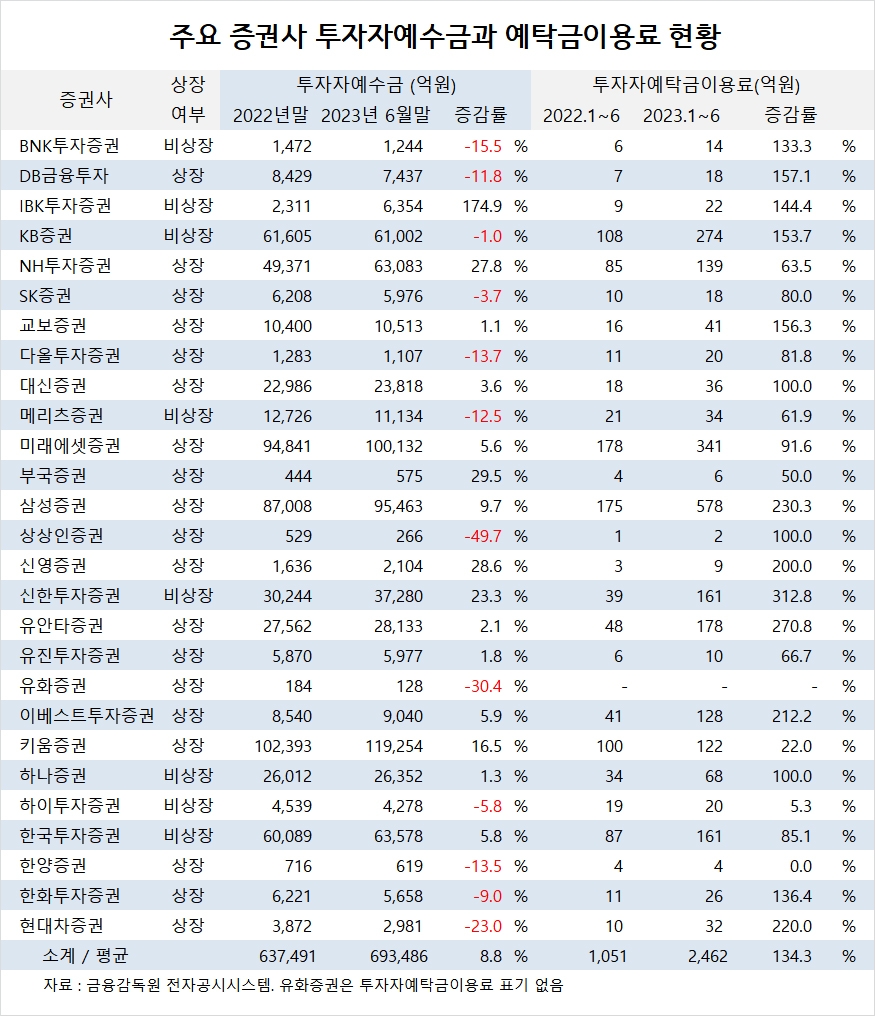 DB금융투자의 6월말 투자자예수금과 상반기 투자자예탁금이용료는 각각 7437억원과 18억원, IBK투자증권이 각각 6354억원과 22억원, KB증권이 각각 6조1002억원과 274억원, NH투자증권이 각각 6조3083억원과 139억원, SK증권이 각각 5976억원과 18억원을 나타냈습니다.