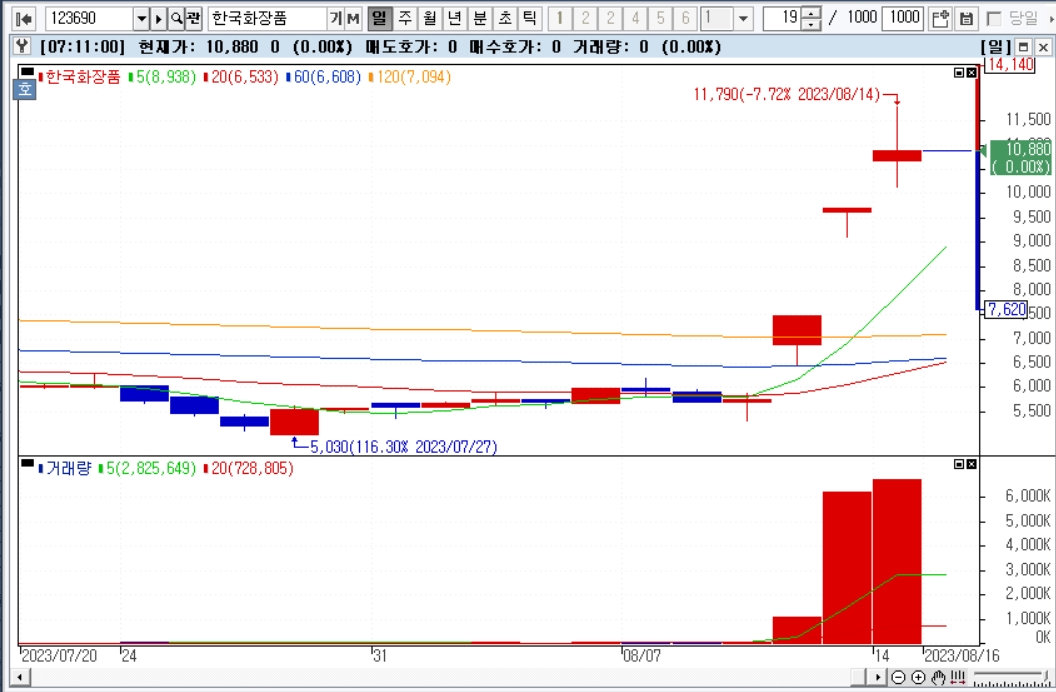 한국화장품은 이달 9일부터 14일까지 4거래일 연속 상승을 이어가며 8월 들어 주가상승률 94.29%를 기록하고 있다.