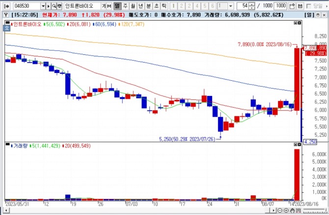 이미지 확대보기16일 한국거래소에 따르면, 인트론바이오 주가는 이날 오후 3시 20분 현재 전 거래일 대비 29.98% 상승한 7890원에 거래되고 있다.