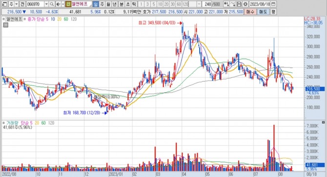 이미지 확대보기엘앤에프의 주가는 18일 오전 9시 3분 현재 전일보다 1만500원(4.63%) 내린 21만6500원에 거래되고 있습니다.