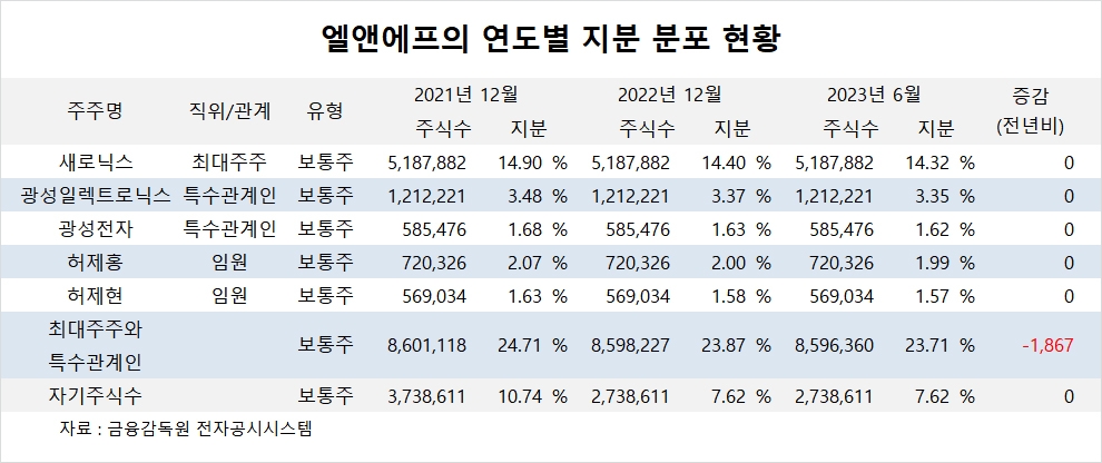 이미지 확대보기엘앤에프의 최대주주는 새로닉스로 지분 14.32%를 보유하고 있습니다.