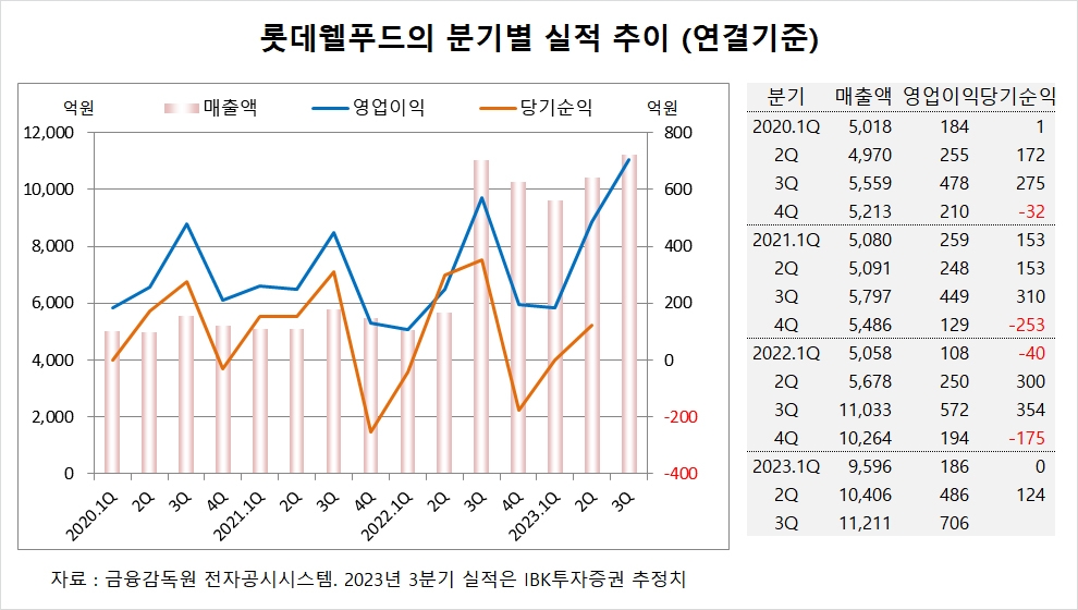 IBK투자증권은 롯데웰푸드의 3분기 연결기준 매출액이 1조1211억원, 영업이익이 706억원에 이를 것으로 전망하고 있습니다.