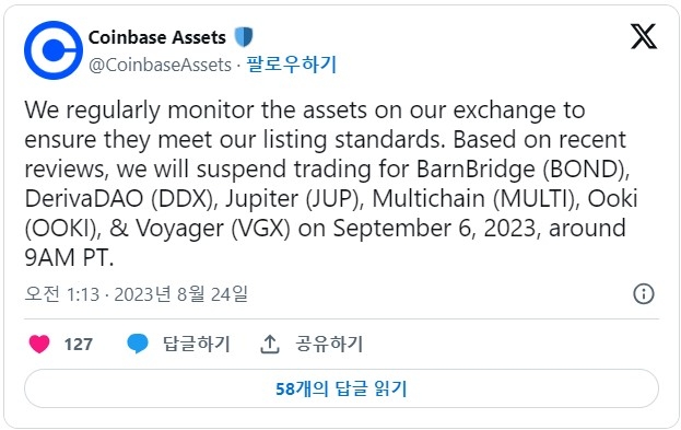 코인베이스는 24일 소셜 미디어 X(이전 '트위터')를 통해 "당사는 거래소에 상장된 자산이 당사의 상장 기준을 충족하는지 정기적으로 모니터링하고 있다"면서 6개 코인 상장 폐지 소식을 전했다.