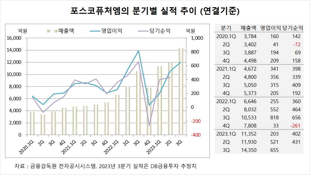 DB금융투자는 포스코퓨처엠의 3분기 연결기준 매출액이 1조4350억원, 영업이익이 655억원에 이를 것으로 전망하고 있습니다.