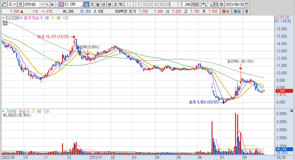 이미지 확대보기CJ CGV의 주가는 30일 오전 9시 10분 현재 전일보다 110원(1.47%) 오른 7580원에 매매되고 있습니다.