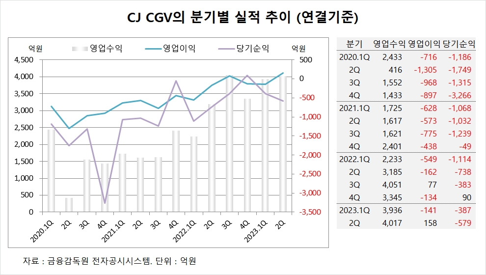 이미지 확대보기CJ CGV는 올해 2분기 연결기준 매출액이 4017억원, 영업이익이 158억원, 당기순이익이 –579억원을 기록했다고 공시했습니다.