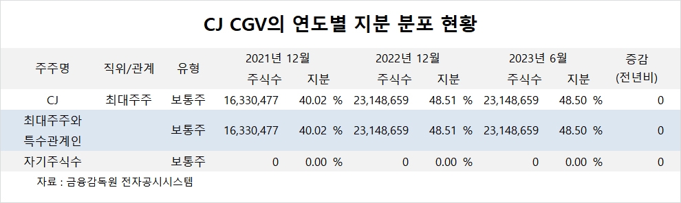 이미지 확대보기CJ CGV의 최대주주는 지주회사인 CJ로 지분 48.50%를 보유하고 있습니다.