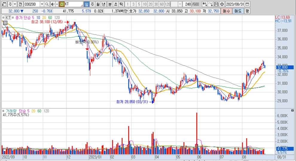 이미지 확대보기KT의 주가는 31일 오전 9시 10분 현재 전일보다 250원(0.76%) 내린 3만2800원에 매매되고 있습니다.