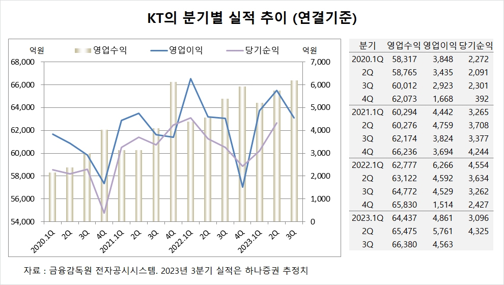 하나증권은 KT의 3분기 연결기준 매출액이 6조6380억원, 영업이익이 4563억원에 이를 것으로 전망하고 있습니다.