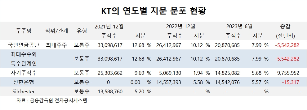 이미지 확대보기KT의 최대주주는 국민연금공단으로 지분 7.99%를 보유하고 있습니다. 국민연금공단은 올해 상반기 KT 주식 554만여주를 팔아 지분을 낮추고 있습니다.