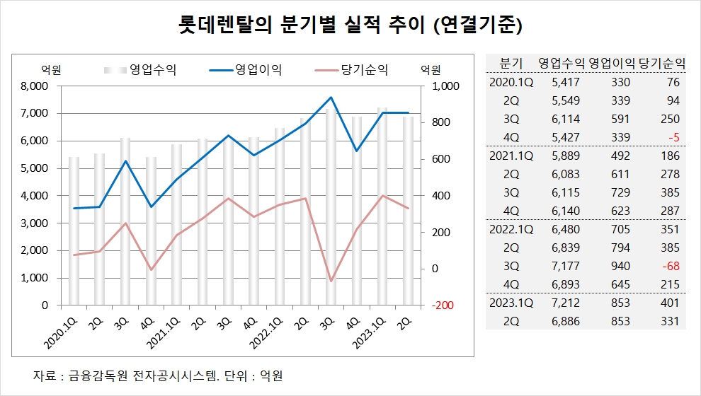 이미지 확대보기롯데렌탈은 2분기 연결기준 매출액이 6886억원, 영업이익이 853억원, 당기순이익이 331억원을 기록했다고 공시했다.