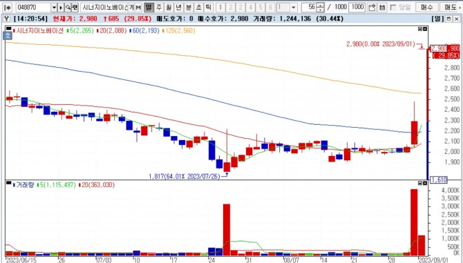 이미지 확대보기1일 한국거래소에 따르면 이날 주식시장에서 시너지이노베이션은 전일 대비 29.8% 상승한 2980원에 거래되고 있고, 크라우드웍스 또한 상한가를 기록하면서 6만1200원에 거래되고 있다.