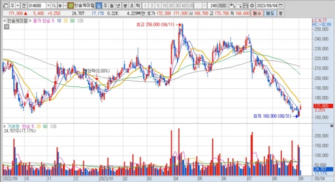 이미지 확대보기한솔케미칼의 주가는 4일 오전 9시 10분 현재 전일보다 5400원(3.25%) 오른 17만1800원에 매매되고 있다.
