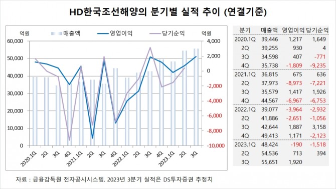 DS투자증권은 HD한국조선해양의 3분기 연결기준 매출액이 5조5651억원, 영업이익이 1920억원에 이를 것으로 전망했다.