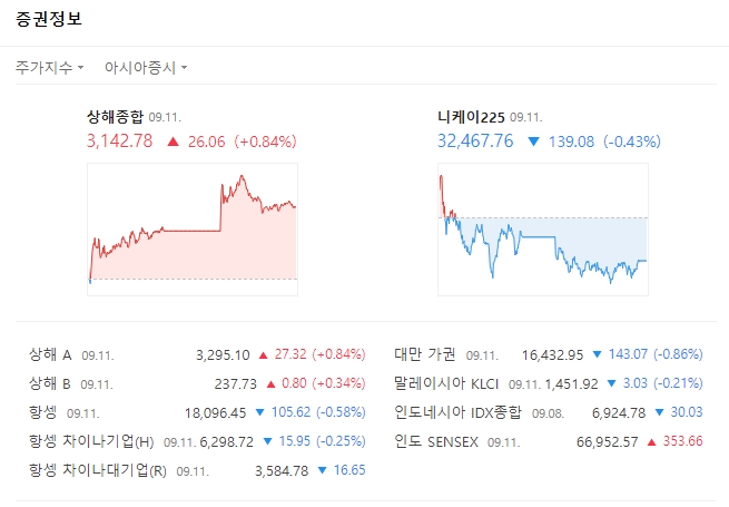 오후 5시 45분 현재 홍콩 항셍지수는 1만8096.45으로 전일대비 105.62(-0.58%)포인트 하락했고, 인도증시 센섹스지수는 전 거래일보다 367.28 (+0.55%) 상승한 6만6966.19를 기록하고 있다. 싱가포르 ST지수는 전장 대비 3.61포인트(0.11%) 오른 3211.36에 거래 중이다.