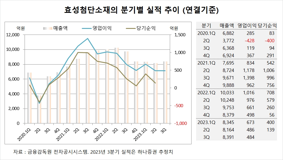 하나증권은 효성첨단소재의 3분기 연결기준 매출액이 8391억원, 영업이익이 484억원에 이를 것으로 전망했다.