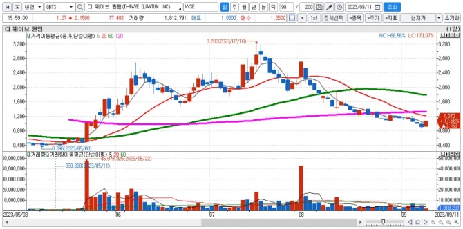 이미지 확대보기11일(현지시간) 뉴욕증시에서 양자 컴퓨팅 시스템 소프트웨어 및 서비스를 개발하고 제공하는 디 웨이브 퀀컴은 17.40% 폭등한 1.07달러에 거래를 마쳤다.