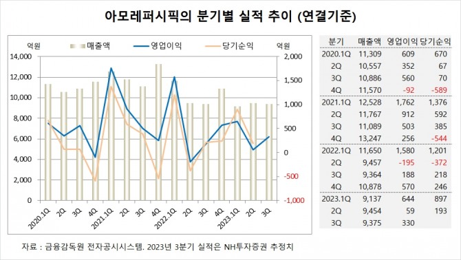 NH투자증권은 아모레퍼시픽의 3분기 연결기준 매출액이 9375억원, 영업이익이 330억원에 이를 것으로 내다봤다. 3분기 영업이익은 시장 컨센서스인 510억원을 하회할 전망이다.