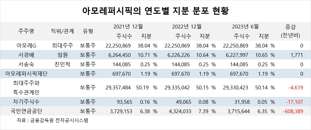 이미지 확대보기아모레퍼시픽의 최대주주는 아모레G(아모레퍼시픽그룹)로 지분 38.04%를 보유하고 있다.