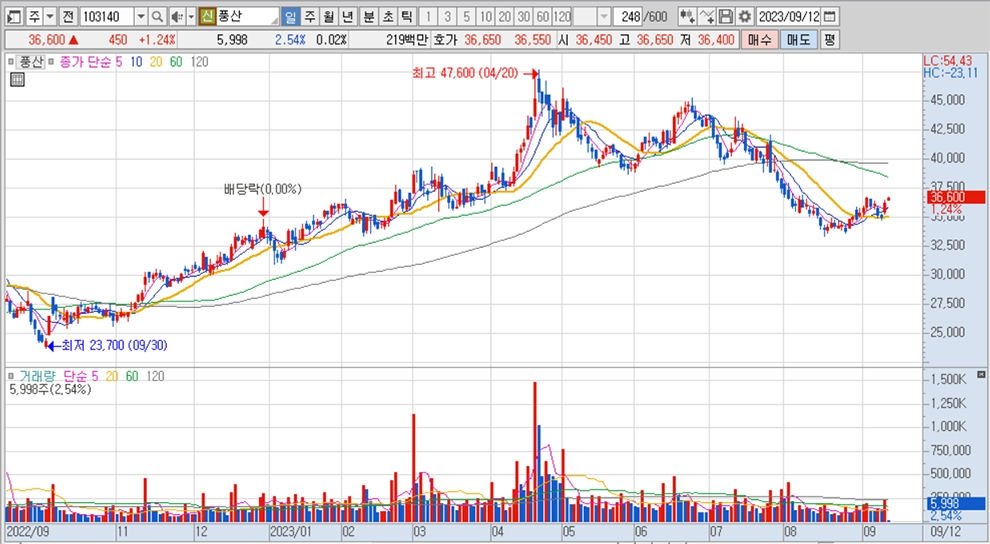 이미지 확대보기풍산의 주가는 12일 오전 9시 3분 현재 전일보다 450원(1.24%) 오른 3만6600원에 거래되고 있다.
