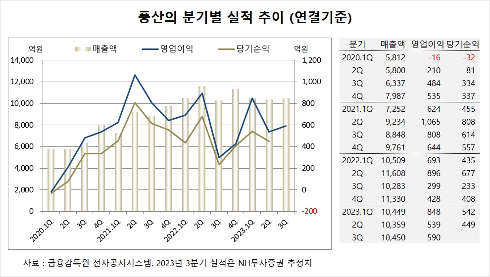NH투자증권은 풍산의 3분기 연결기준 매출액이 1조450억원, 영업이익이 590억원에 이를 것으로 내다봤다. 3분기 영업이익은 시장 컨센서스인 610억원에 부합할 전망이다.