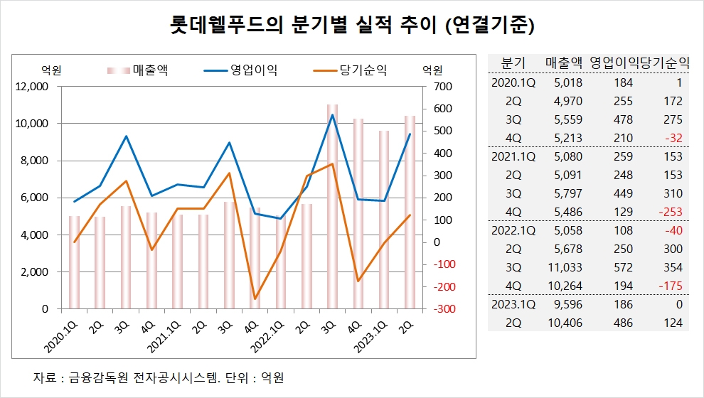 롯데웰푸드는 롯데푸드와의 합병으로 지난해 3분기부터 매출액이 급증했다.