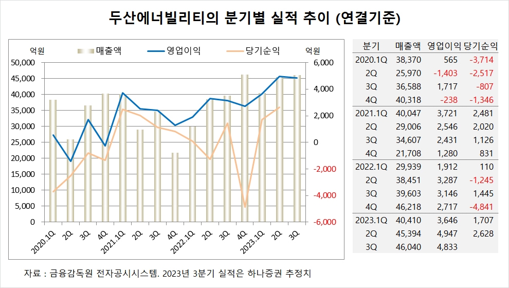 하나증권은 두산에너지빌리티의 3분기 연결기준 매출액이 4조6040억원, 영업이익이 4833억원에 이를 것으로 전망했다.