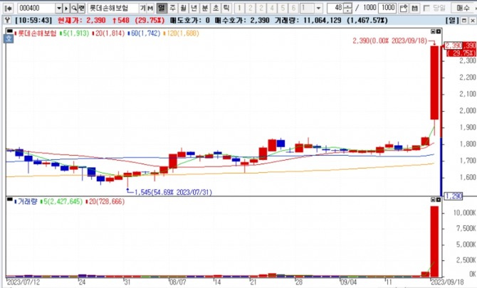 이미지 확대보기18일 한국거래소에 따르면, 롯데손해보험 주가는 이날 오전 10시 35분 현재 전 거래일 대비 29.75% (548원) 상승한 2390원에 거래되고 있다.