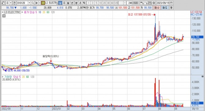 이미지 확대보기LS일렉트릭의 주가는 19일 오전 9시 5분 현재 전일보다 1600원(1.58%) 내린 9만9700원에 거래되고 있다.