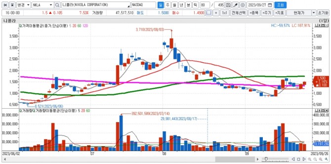 이미지 확대보기니콜라 주가는 마이너스 1.4%로 장을 시작해 장중 저가 마이너스 4.29%까지 밀렸으나 장 중반 이후 매수세가 유입되며 장중 고가 10%까지 올랐다 7.14%에 거래를 마쳤다.