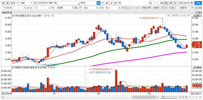 이미지 확대보기27일(현지시간) 뉴욕 주식시장에서 아이온큐 주가는 8.70% 급등한 14.24달러를 기록했다. 아이온큐 주가는 지난 13일부터 8거래일 연속 하락했다.