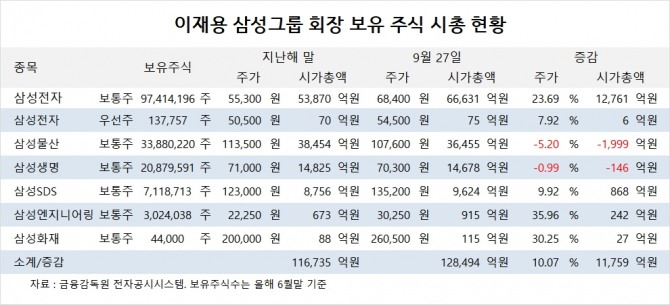 이재용 회장이 보유한 주식의 시가총액은 지난해 말보다 1조1759억원 증가한 12조8494억원으로 나타났다. 작년 말보다 10.07% 불었다.