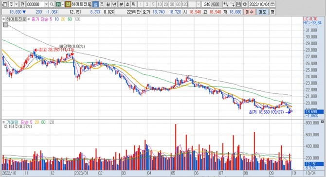 이미지 확대보기하이트진로의 주가는 4일 오전 9시 3분 현재 전일보다 200원(1.06%) 내린 1만8690원에 거래되고 있다.