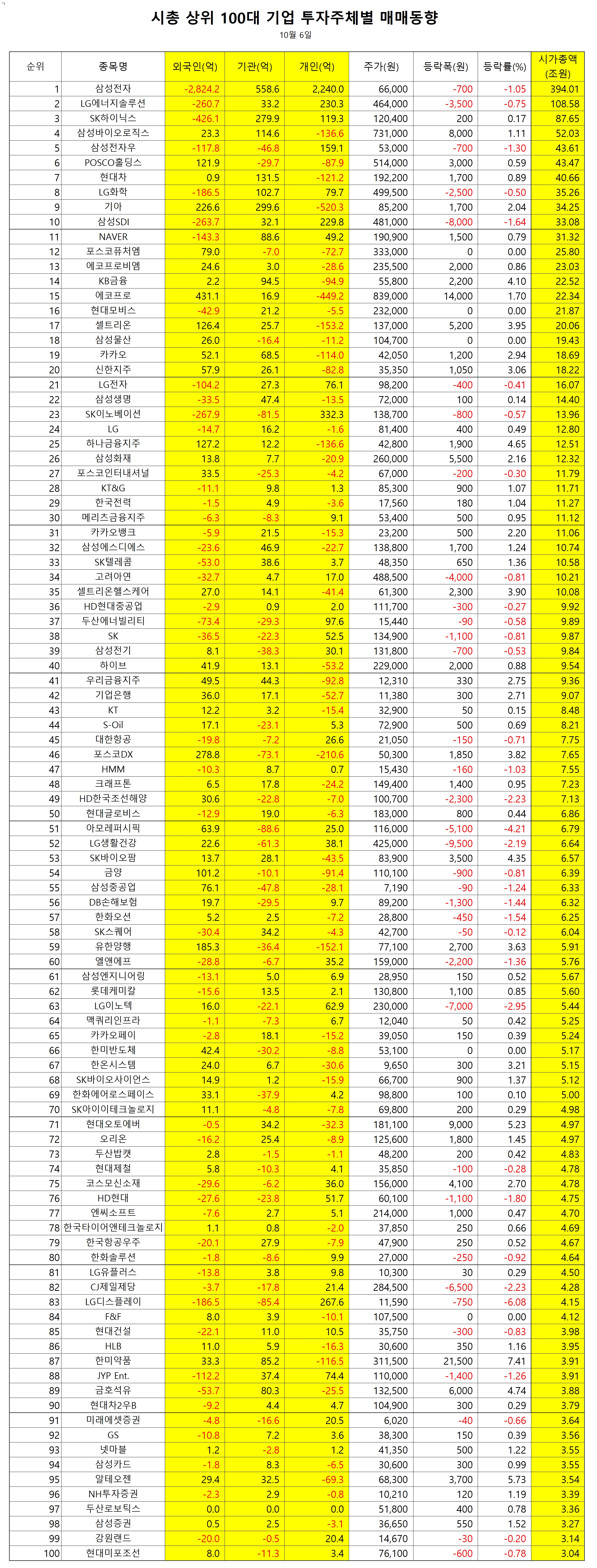 1위 삼성전자 2240억원(337만주), 2위 SK이노베이션 332억원(24만주), 3위 LG디스플레이 268억원(228만주), 4위 LG에너지솔루션 230억원(5만주), 5위 삼성SDI 230억원(5만주), 6위 삼성전자우 159억원(30만주), 7위 SK하이닉스 119억원(10만주), 8위 두산에너빌리티 98억원(63만주), 9위 LG화학 80억원(2만주), 10위 LG전자 76억원(8만주), 11위 STX 67억원(36만주), 12위 LG이노텍 63억원(3만주), 13위 LG화학우 54억원(2만주), 14위 SK 52억원(4만주), 15위 HD현대 52억원(9만주), 16위 NAVER 49억원(3만주), 17위 LS ELECTRIC 46억원(5만주), 18위 LG생활건강 38억원(1만주), 19위 코스모신소재 36억원(2만주), 20위 이수페타시스 34억원(12만주)
