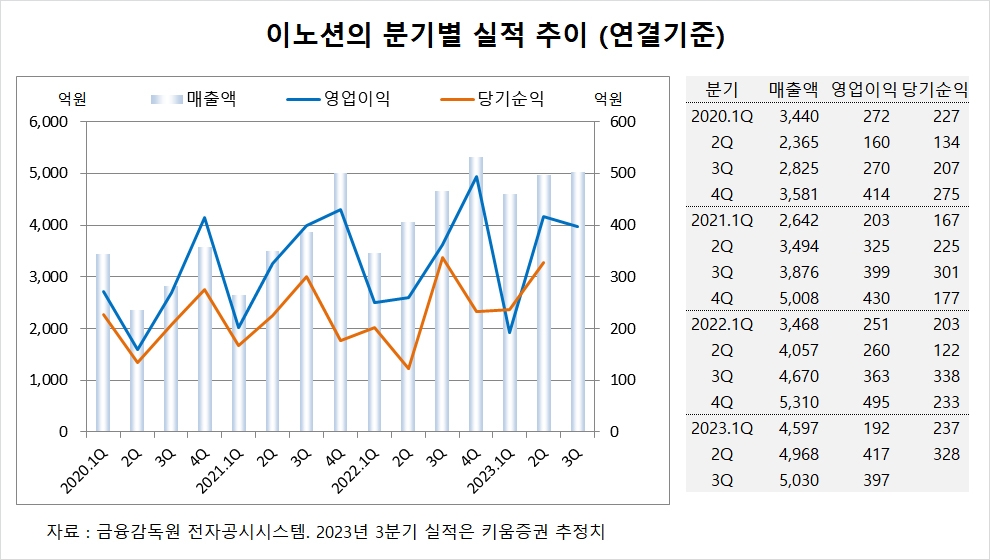 키움증권은 이노션의 3분기 연결기준 매출액이 5030억원, 영업이익이 397억원에 이를 것으로 전망했다.